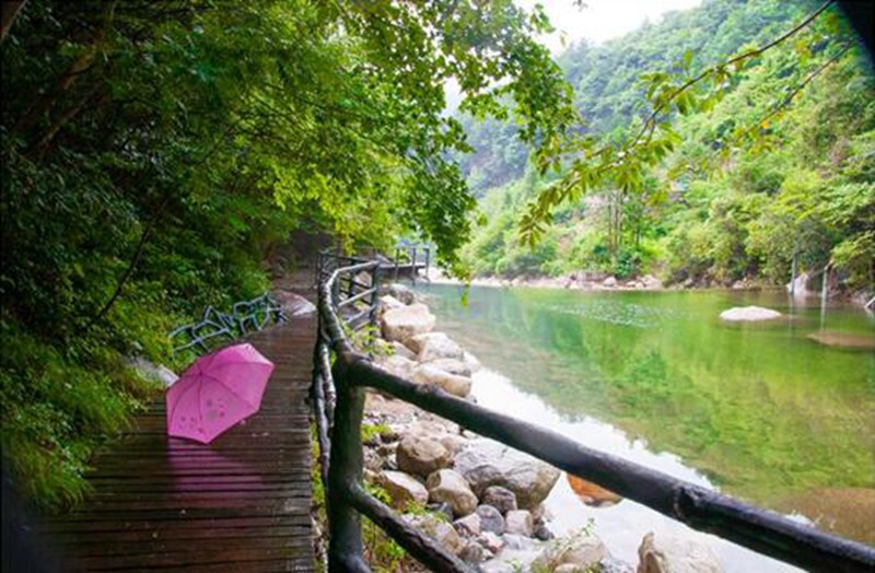 下午两个多小时车程,直奔天堂寨白马大峡谷,迎接我的,是一场酣畅淋漓的大雨,将我挡在门前,来不及奔跑,急风裹着骤雨,打湿我的衣裳。同事打趣,平日喜爱诗歌的你,何不即景吟诗一首?望着连绵的乌云和起伏的黛山,竟一时说不出一句话来。此刻,只见同行的同事,撑一把黑伞,正拾级而上,不急不缓,闲庭信步,此时的狂风暴雨似乎与他无关,同事见状哈哈大笑,正所谓“心中有晴雨亦晴”。