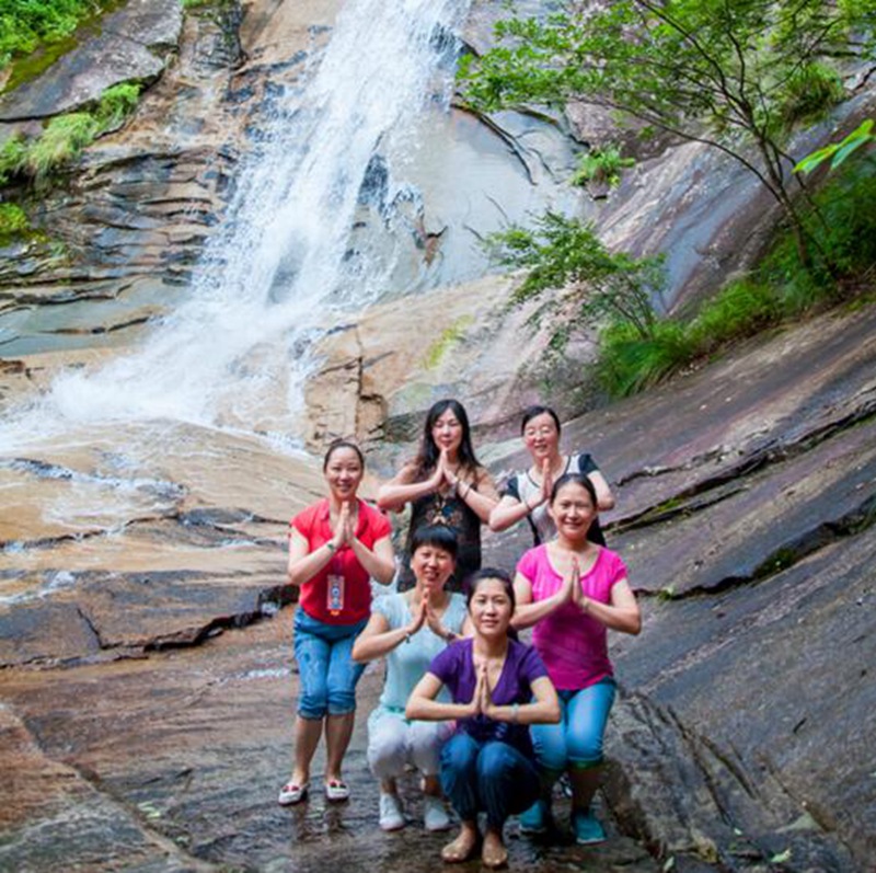 第二天的行程,至天马自然保护区爬山,途经五道瀑,每道瀑都有一个美丽的传说。天公作美,太阳偶尔露出脸,从树缝间筛下一个个小光斑,山风习习,惬意微凉,感觉不到盛夏的炎热。呼吸着新鲜的氧负离子,神清气爽,脚步变得轻盈,走久了路边歇歇脚,停下来跟一只爬行的毛毛虫说说话,看一张蜘蛛结的网,和不知名的植被合个影,树根边覆满一抔抔青苔,生出一朵朵打着伞的菌菇。在银弓瀑,清澈见底五彩斑斓的石块间,发现潜在水底游动的娃娃鱼,惊喜,那一刻仿佛自己就是一条欢快的鱼,自由而自在。晶莹剔透的泻玉瀑响彻山涧,雾气迷蒙,打湿我们的衣角,在瀑布雨跳动的音符伴奏下,我们放松身心,感恩生活,感受瑜珈之美。