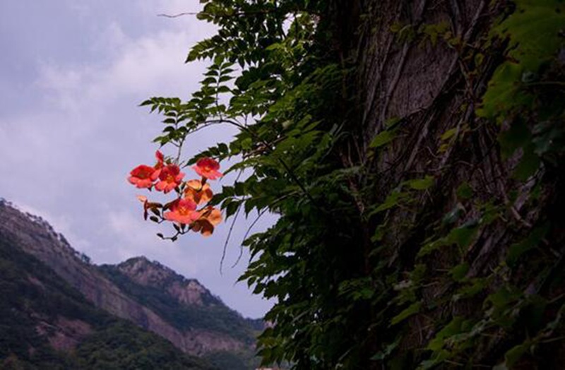 峡谷入口处,一团盛开的凌霄花吸引了我的视线,“凌云而上,直冲云霄”,凌霄花,我喜欢你的名字。