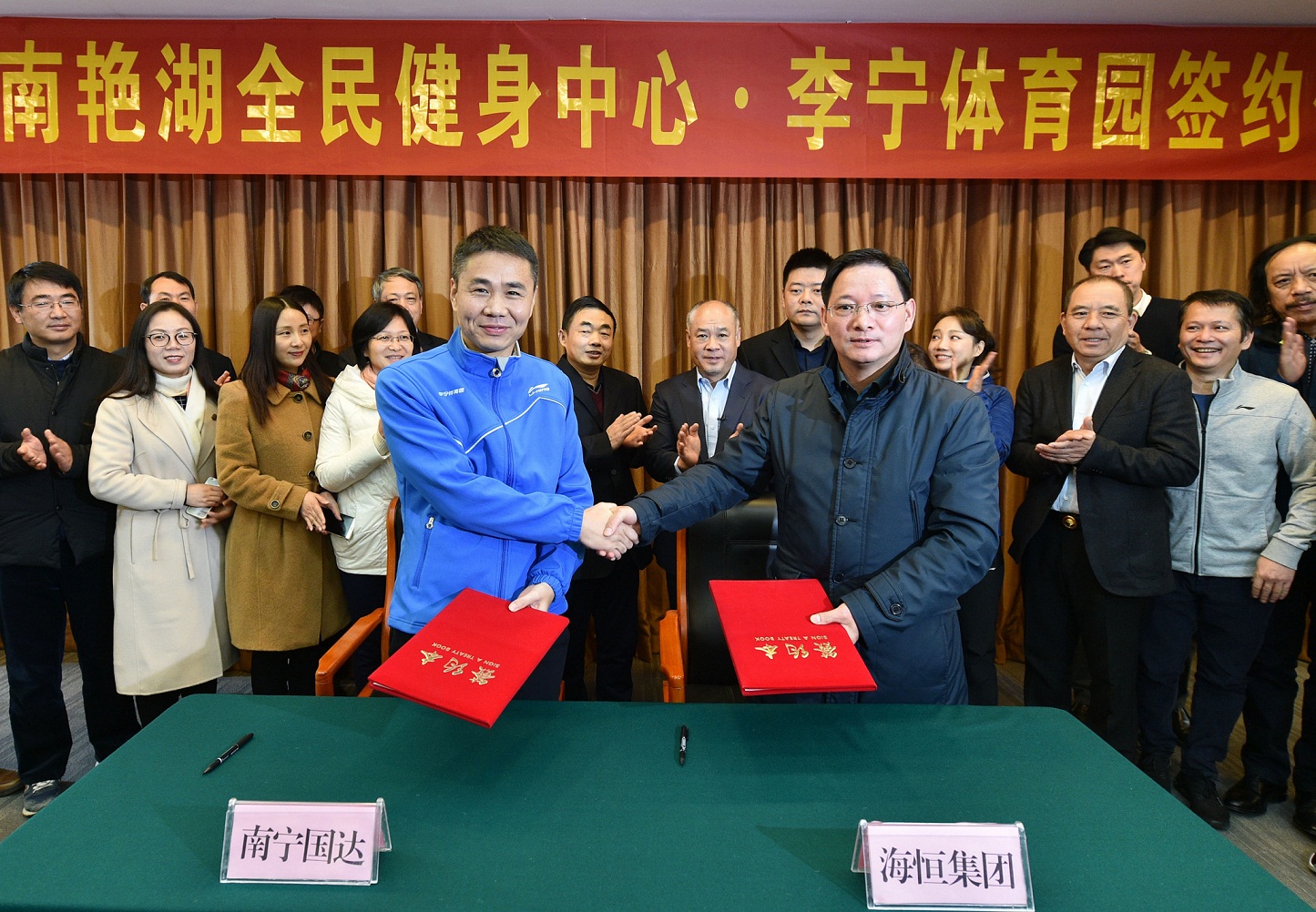 12月19日上午,经开区南艳湖全民健身中心·李宁体育园签约仪式在管委会举行。合肥市市直相关部门、经开区管委会等有关负责人出席签约仪式。李宁公司董事长、奥运冠军李宁,非凡中国执行董事、体操世界冠军李春阳,国达体育董事长张健等出席签约仪式。集团总经理徐祥忠与国达体育(李宁体育园)总经理赵天凡签约。