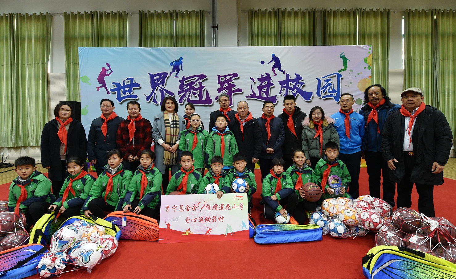 签约仪式后,李宁率冠军团队一行来到合肥市莲花小学,由冠军团队与学生团队举行了一场“世界冠军进校园”活动,分别开展了迷你乒乓球体验赛、趣味羽毛球、阳光足球3V3等趣味比赛,学生团队充分感受了体育冠军的魅力与风采。活动期间,李宁公司向莲花小学捐赠了体育器材。