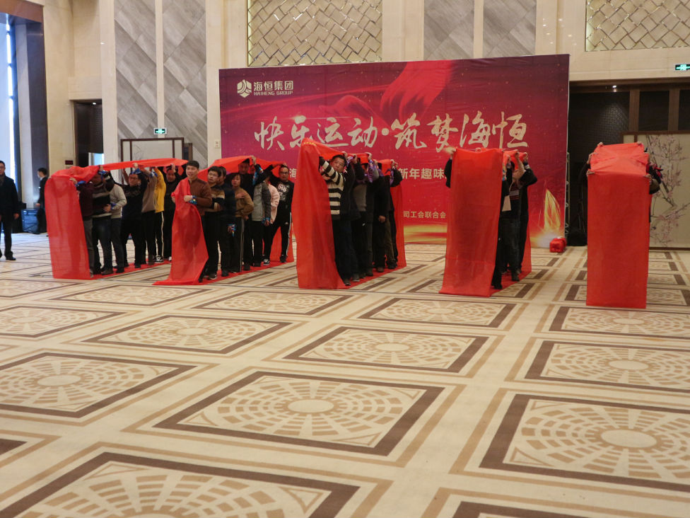 第一个项目财源滚滚,拉开趣味竞技运动会序幕。五支代表队,每支10名队员,排成整齐的行列,手持大红色环行布带,脚踩红布,合着啦啦队铿锵有力的节拍,如一辆开动的红色车轮,在地毯上加速滚动,循环永不停息,预示着海恒集团的明天,海纳百川财源滚滚。
